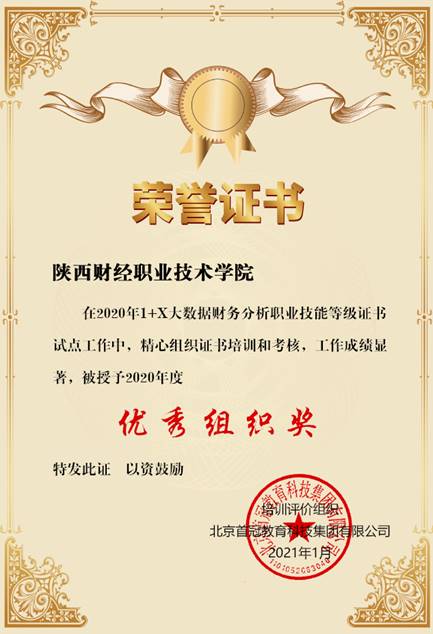 2021年1月23日,我院喜获北京首冠集团颁发的1+X大数据财务分析职业技能等级证书试点优秀组织奖,在全国300多个职业院校中获得此殊荣,体现了组织方对我院1+X大数据财务分析职业技能等级证书从组织培训、报名、学生参加证书认证整个组织和培训工作的肯定。