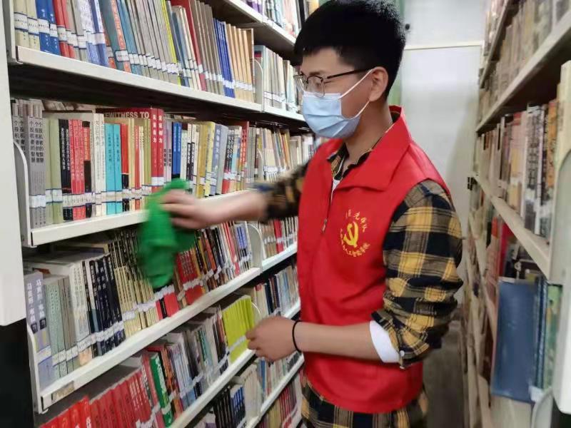 本次志愿服务活动,大家积极听从图书馆赵幽兰、赵蓓两位老师的安排,认真仔细的对图书馆二、三、四楼书架进行图书整理,书架擦拭,地面清洁等,活动中曹耀辉带领师生志愿者一起动手,学生党支部书记谢卫朋及王立户老师现场指导志愿服务者分工协作,认真仔细,一丝不苟的清理卫生死角,最终使各楼层图书书架及地面卫生干净整洁、焕然一新。大家不怕脏、不怕累、热情高涨的劳动场面得到了图书馆老师们的高度肯定与赞许。