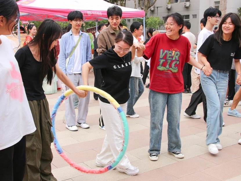 在“传递团圆”活动现场,同学们围在一起,齐心协力、共同努力,使呼啦圈顺利地传递下去,通过小组成员的互动,传达出团圆的重要性和美好;“仙人吹气”环节非常考验同学们的肺活量和技巧,现场气氛热烈非凡,欢笑声此起彼伏。