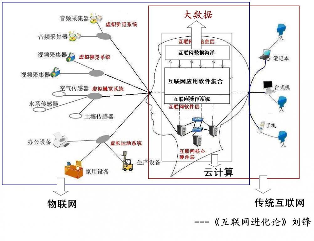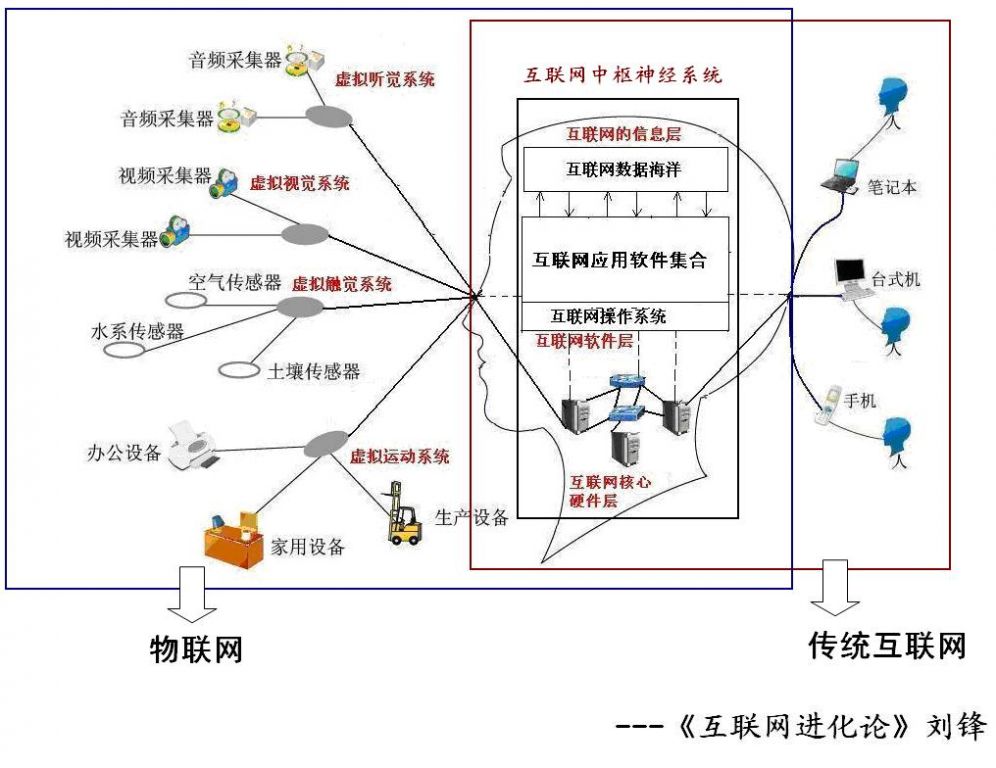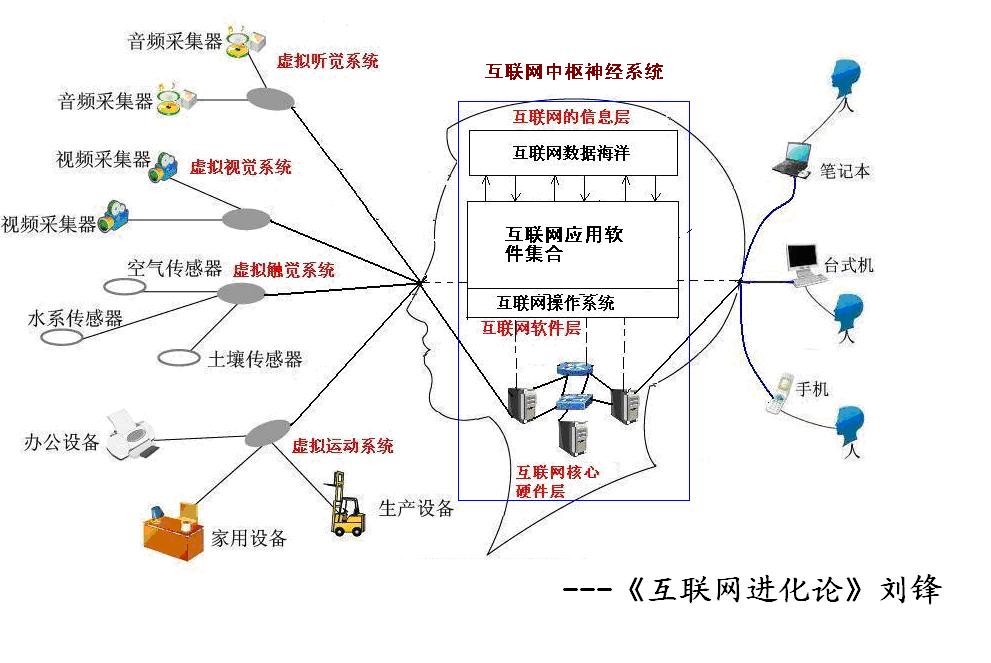 我们在《互联网进化论》一书中提出“互联网的未来功能和结构将于人类大脑高度相似,也将具备互联网虚拟感觉,虚拟运动,虚拟中枢,虚拟记忆神经系统” ,并绘制了一幅互联网虚拟大脑结构图。