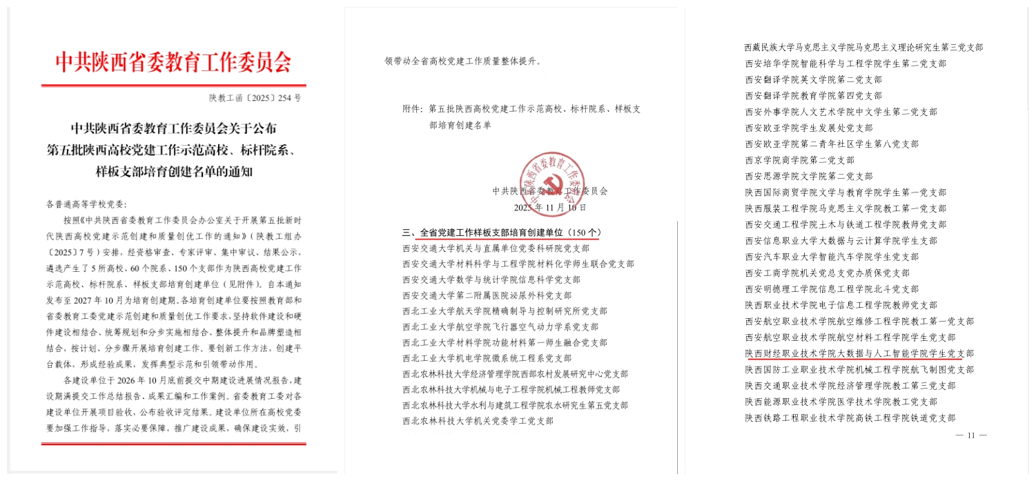 近日,中共陕西省委教育工作委员会公布了陕西高校第五批新时代高校党建示范创建和质量创优工作遴选结果,我校大数据与人工智能学院学生党支部获批“全省党建工作样板支部培育创建单位”。此次入选不仅是我校基层党支部标准化建设取得的新成效,更是学校以党建引领专业发展、赋能人才培养的又一重要成果。