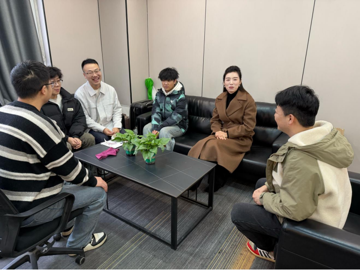 走访组抵达西安亿颗糖电子科技有限公司后,与企业人力资源部负责人、实习指导教师及学生代表召开座谈交流会。企业负责人首先对实习学生的整体情况进行介绍:本次实习的学生涵盖应用电子技术、数字媒体技术两个专业,其中应用电子技术专业的邓荣琦、强旭杰等同学在生产技术岗、设备维护岗参与实习;数字媒体技术专业的同学则在UI设计岗、视频剪辑岗、新媒体运营岗开展实践,目前均已完成基础岗位培训,进入独立实操阶段,能够协助企业完成日常生产与项目任务。