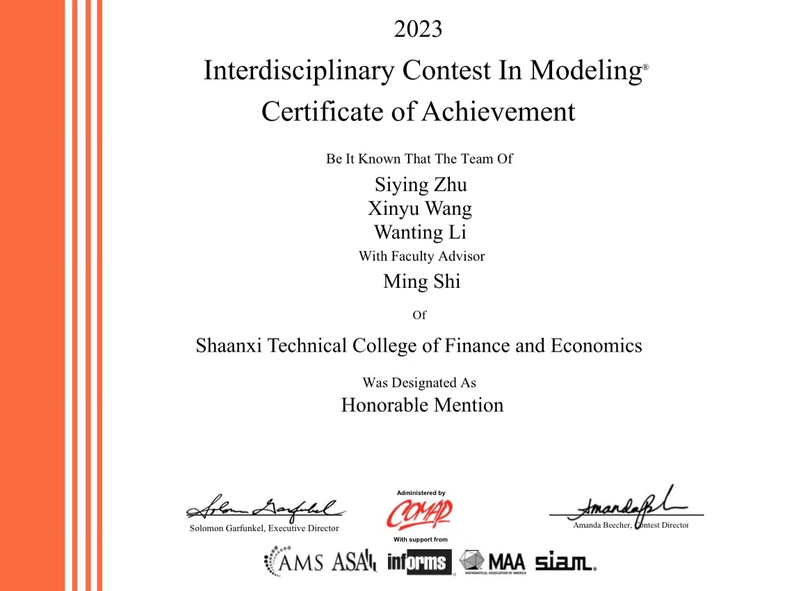 近日,2023年美国大学生数学建模竞赛(MCM/ICM)结果公布。我校学生朱思颖、王新宇、李婉婷在师铭老师的指导下,荣获Honorable Mention(国际二等奖)的好成绩,这是我校学生首次参加这项比赛并获奖。