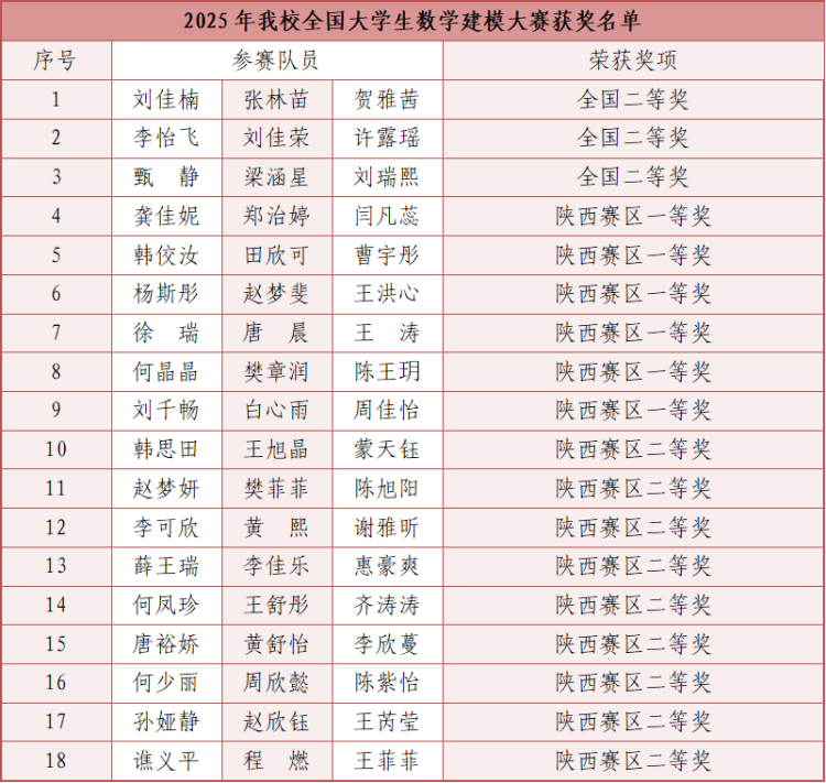 近日,2025年全国大学生数学建模竞赛陕西赛区获奖名单正式揭晓。我校代表队荣获全国二等奖3项,陕西赛区一等奖6项、陕西赛区二等奖9项的优异成绩。同时,我校师铭老师获陕西赛区优秀指导教师。