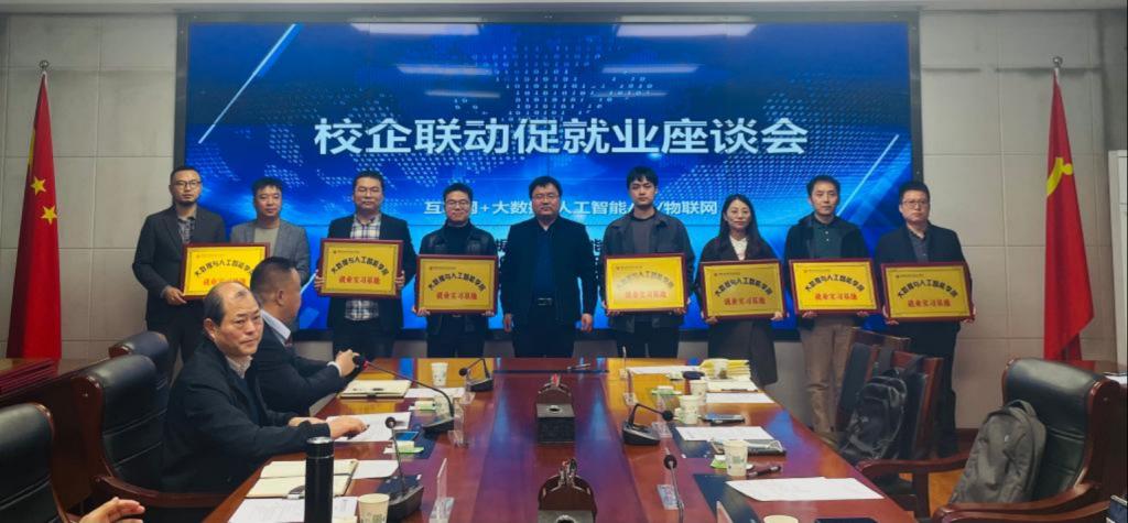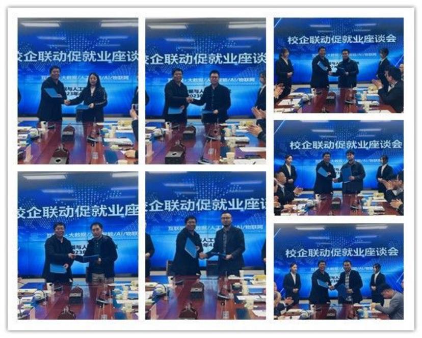 大数据与人工智能学院院长王双明与7家企业分别签署了校企合作协议,殷兴光分别授予了7家企业“就业实习基地”牌。企业授予我校“校企合作人才培养基地”牌,大数据与人工智能学院党总支副书记殷蓬勃接牌。