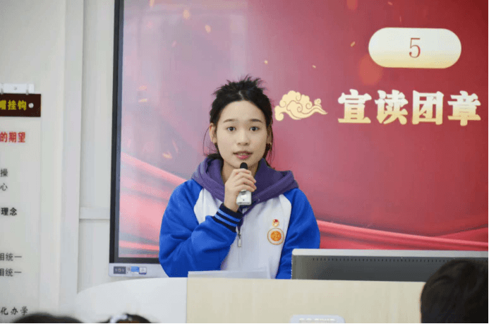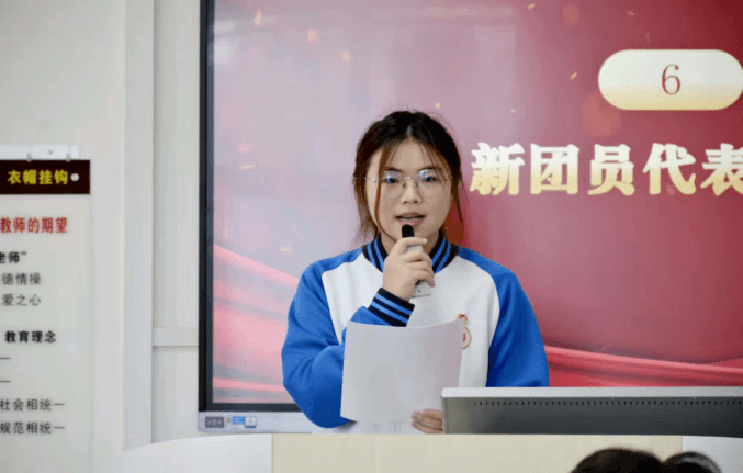 仪式第六项:新发展团员代表吕佳瑶同学发言。她激励所有新团员:“加入共青团,不仅代表一种荣誉,更是一种责任。作为一名新团员,始终要做到初心如磐,使命在肩,积极参加团组织的各项活动,遵守共青团章程,履行团员义务。”