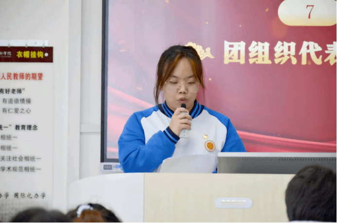 仪式第七项: 团组织代表刘瑞娜同学发言。她提醒新团员要时刻牢记自己是共青团员,时刻要按照党员的标准严以律己。奋斗,是青春最亮丽的底色,激励团员们要点亮青春梦想,澎湃创新动力,激昂奋斗旋律,淬炼斗争精神,做新时代有为的团员。