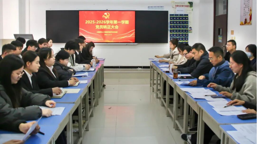 2025年12月11日,大数据与人工智能学院学生党支部召开党员转正大会,讨论杨佳瑞等19名预备党员的转正事宜。本次会议由支部书记谢卫朋主持,学院党总支书记袁永彦以支部党员身份参会。