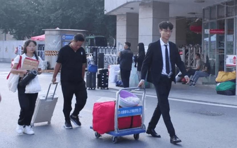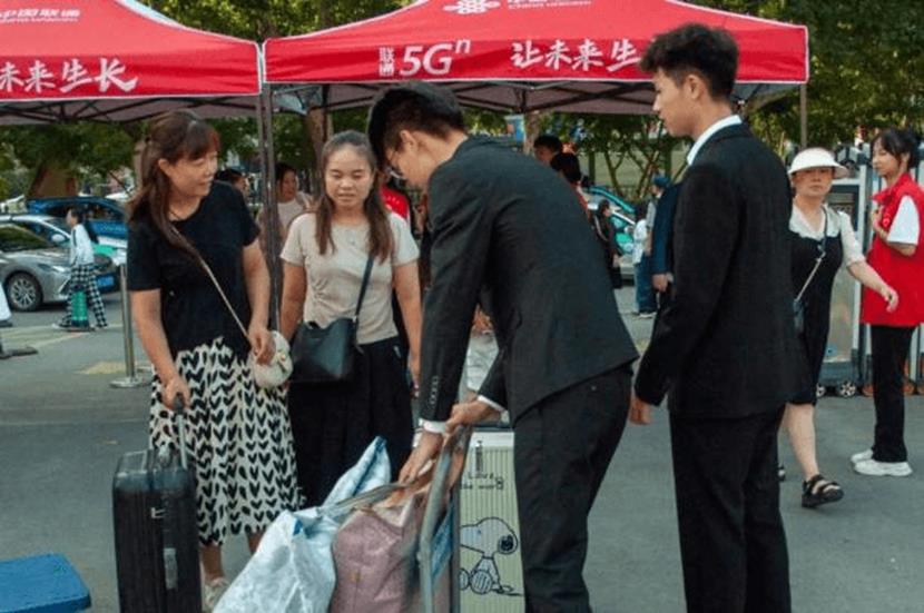 志愿者拉着小板车,帮助新生搬行李