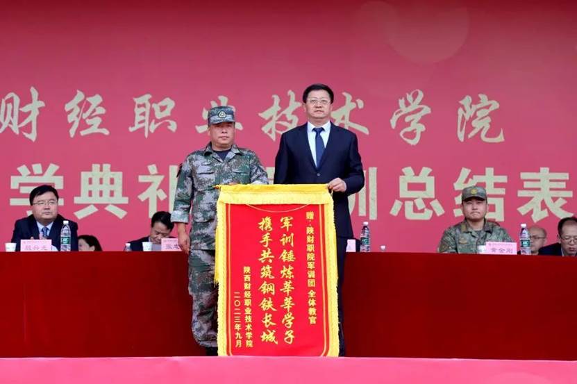 整齐划一的队列展示,气势恢宏的男子擒敌拳,英姿飒爽,巾帼不让须眉的女子队列展示、生动逼真的战术演练及内容新颖、精彩纷呈的花样队形表演完美阐释了14天军训团教官和同学们付出的艰辛和汗水。为了对辛苦承训的军训团和教官们表示感谢,党委书记张志华特向2023级新生军训团赠送锦旗。