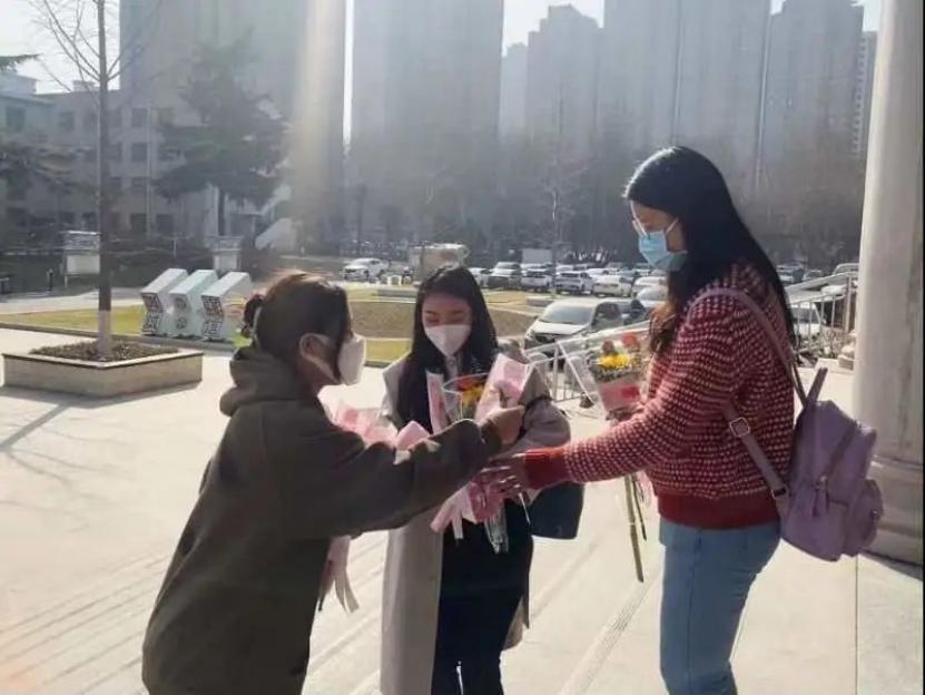 今日同学们手捧鲜花,走向各个办公室,向每位在校的女教师传递真挚的祝福,在这个女神节里,显得格外温馨。此刻,所有的教师,脸上都洋溢着幸福的笑容。“老师,节日快乐”,“老师,您辛苦了”一句句简单而亲切的问候把老师的幸福感装得满满的。映衬着老师的笑脸,和谐温暖的气氛充盈着整个校园。