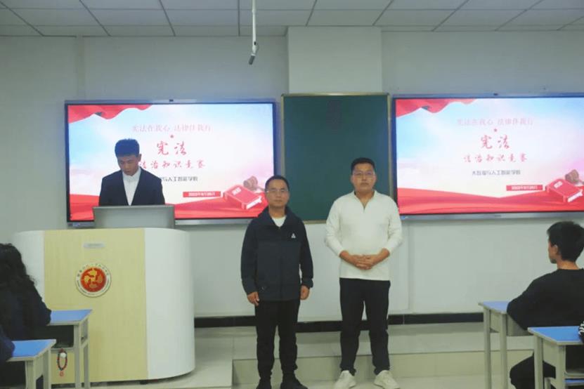 治思想,推动青少年宪法宣传教育常态化长效化,进一步提升普法的针对性与实效性。引导大学生了解宪法知识,理解宪法内涵,自觉尊崇宪法、学习宪法、遵守宪法、维护宪法、运用宪法,成为宪法的忠实崇尚者、自觉遵守者和坚定捍卫者。2023年9月25日19点,大数据与人工智能学院所有参赛选手在教学楼502教室举办了宪法法治知识竞赛活动。出席本次竞赛活动的有学生科副科长王立户、专职辅导员马朝。