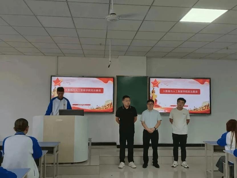 大数据与人工智能学院于9月22日8点,在教学楼5楼502教室组织学生进行宪法晨读。团总支书记谢卫朋,专职辅导员马朝、杨旭东出席活动并向大家讲解学习宪法的重要性。晨读时同学们身着校服,认真严肃的诵读宪法部分条款,学习宪法知识。体会宪法温度、感受宪法力量。