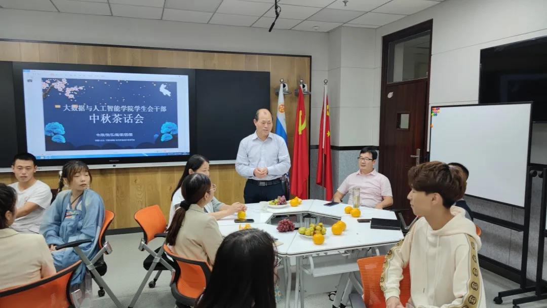 9月21日晚,夕阳刚刚落下帷幕。大数据与人工智能学院学生会干部齐聚教学楼516举行中秋茶话会,大数据与人工智能学院党总支书记兼副院长曹耀辉老师、团总支书记谢卫朋老师、学生科副科长兼团总支副书记李红红老师及大数据与人工智能学院辅导员们前来为学生会干部们送上了中秋祝福,整个教室充满了笑声。同时曹书记对学生会今年的工作作出了认可与赞同。