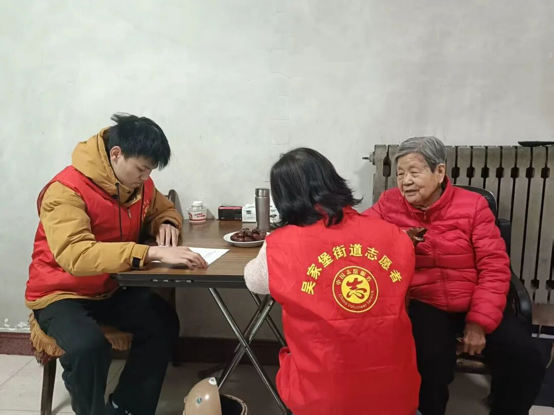 志愿者和社区人员与老人交流