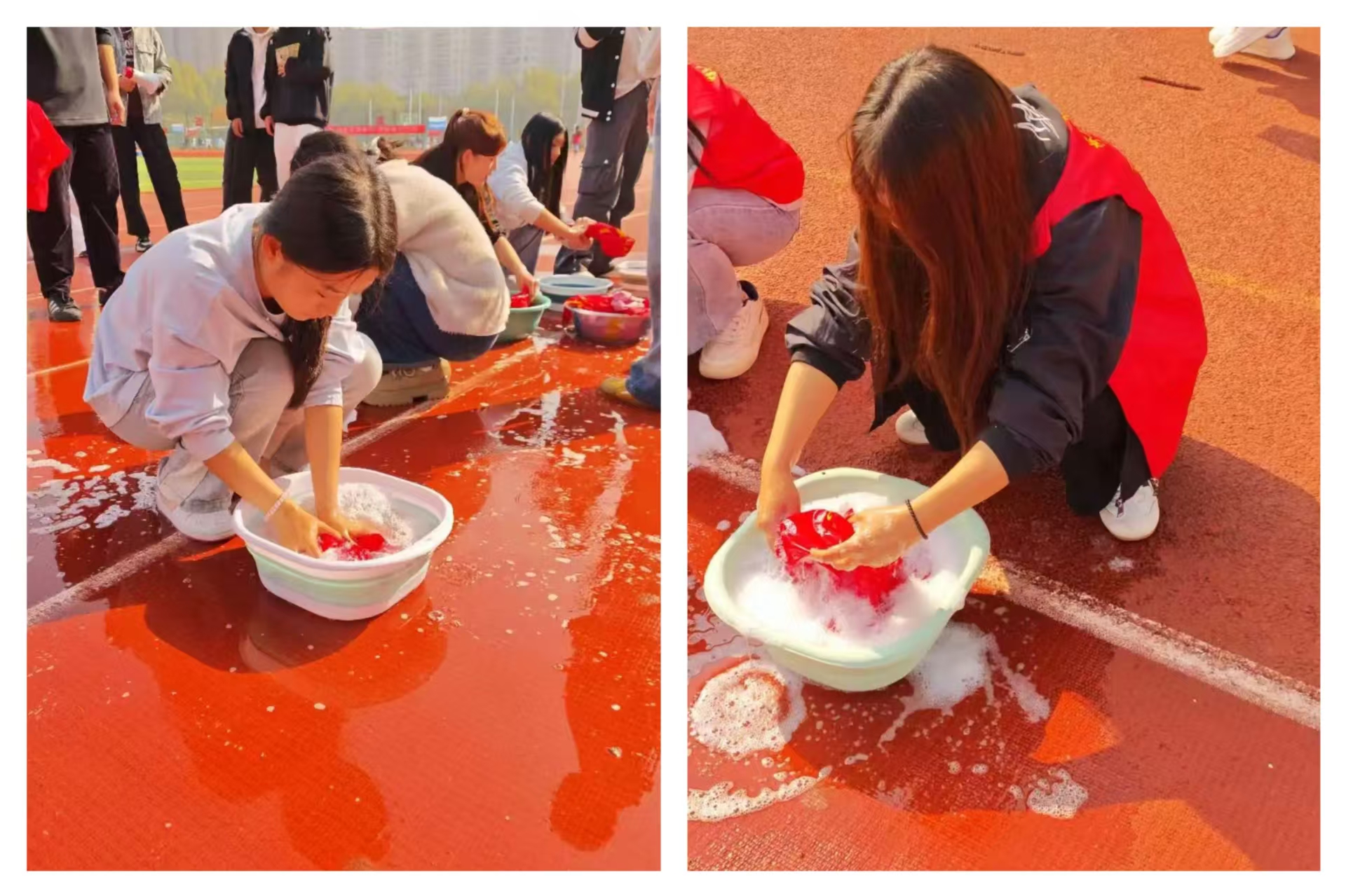 清洗过程中,各小组各司其职,协同协作;后勤组承担接水,换水的保障工作;清洗组则按照“清水侵泡—涂抹洗涤剂—软毛刷轻刷”的步骤,细致处理每件衣物上的污渍。清洗完毕后,由晾晒组将衣服拧干拿到晾晒区晾晒。在大家的共同努力下,志愿服焕然一新。阳光洒在鲜红的衣服上与志愿者忙碌的身影交相辉映,构成了校园里一道亮丽的风景线,参与活动的志愿者纷纷表示亲手为志愿服“焕新”不仅成就感满满,更在集体协作中感受到了温暖与责任,对“献,协作“有了更为深刻的理解。