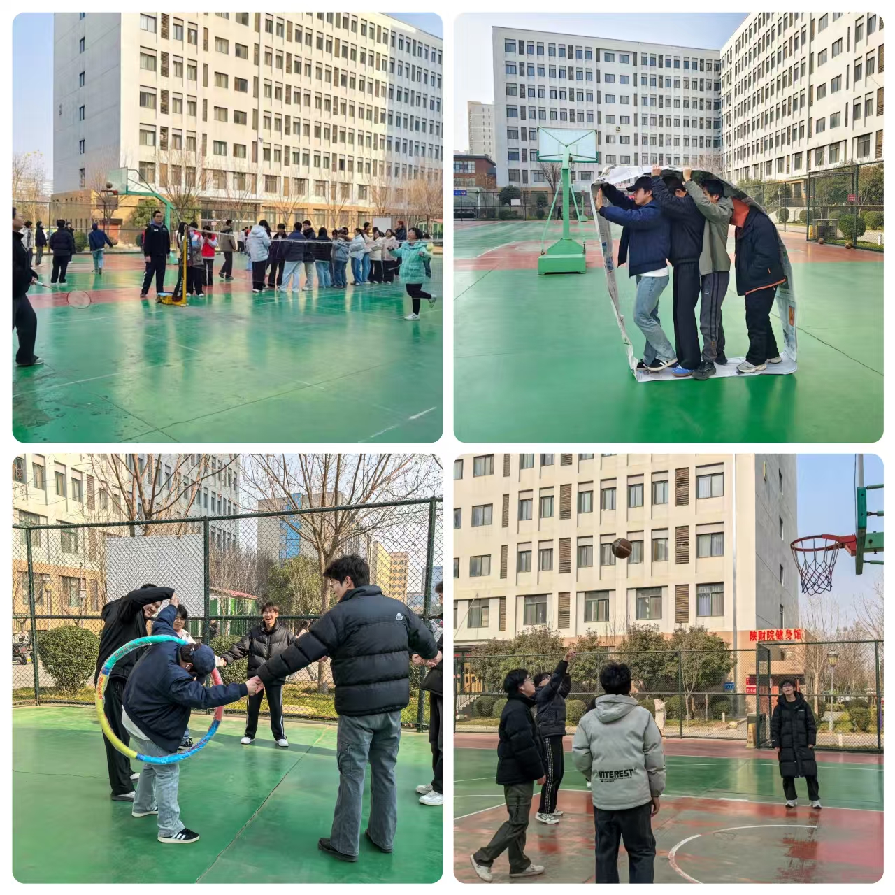 各类球类趣味项目轮番登场,成了整场活动的快乐源泉,无论有没有运动基础,社团同学都玩得十分尽兴。羽毛球欢乐赛现场,大家自由组队两两对打,高远球、扣杀球你来我往,场边观赛同学的加油声、欢呼声接连不断;乒乓球趣味比拼里,颠球闯关的同学眼睛紧紧盯着球,偶尔球落地,惋惜声刚起,身边就有人喊着“再来一次”鼓劲,乒乓接力运输环节更有乐趣,同学们互相提醒节奏、分享小技巧,嬉闹声和喝彩声交织在一起,格外热闹;篮球项目被男生们围得水泄不通,大家轮流上场,抬手、瞄准、投篮一气呵成,进球时的欢呼和没投中时的互相调侃,让这片区域满是青春活力;呼啦圈连环传递项目中,同学们手拉手围成圈,靠身体扭动和彼此配合,依次把呼啦圈从身上钻过去传递给下一人,动作快慢不一引得全场笑声不断;车轮滚滚大作战时,同学们组成小队钻进自制的报纸“车轮”里,齐心操控着往前滚动,沿途的加油声、欢笑声此起彼伏。