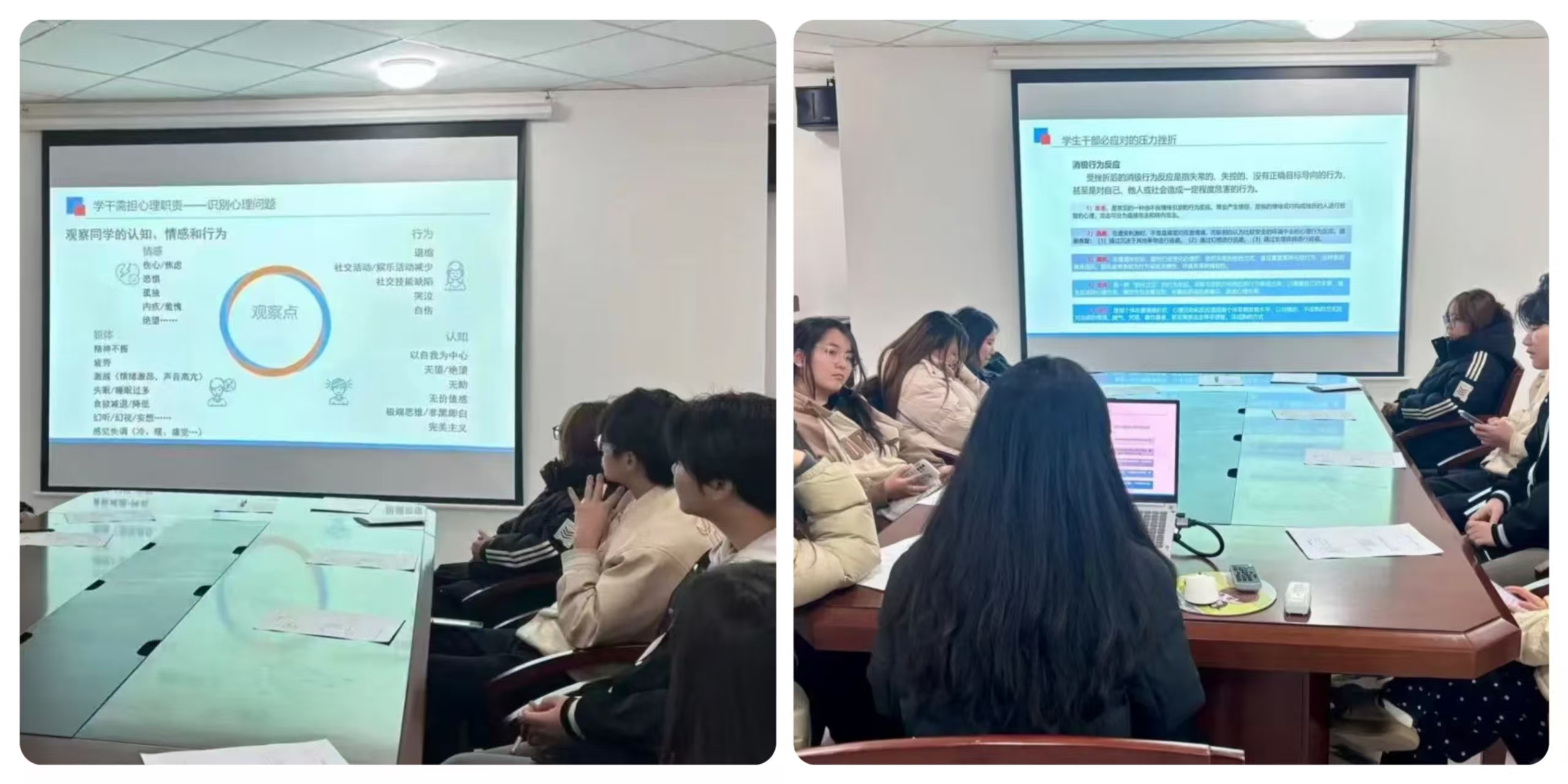 培训以 “贴近学生、贴近生活”为原则,系统讲解等常见心理问题的识别要点,通过具体表现和典型案例,帮助学生干部精准识别各类心理问题的核心特征。同时,培训着重强调,心理委员需秉持真诚、尊重、共情的工作态度,识别并重点关注特殊学生,确保危机情况即时上报。为学生干部开展观察帮扶、推进心理工作提供了清晰且可操作的行动指引。