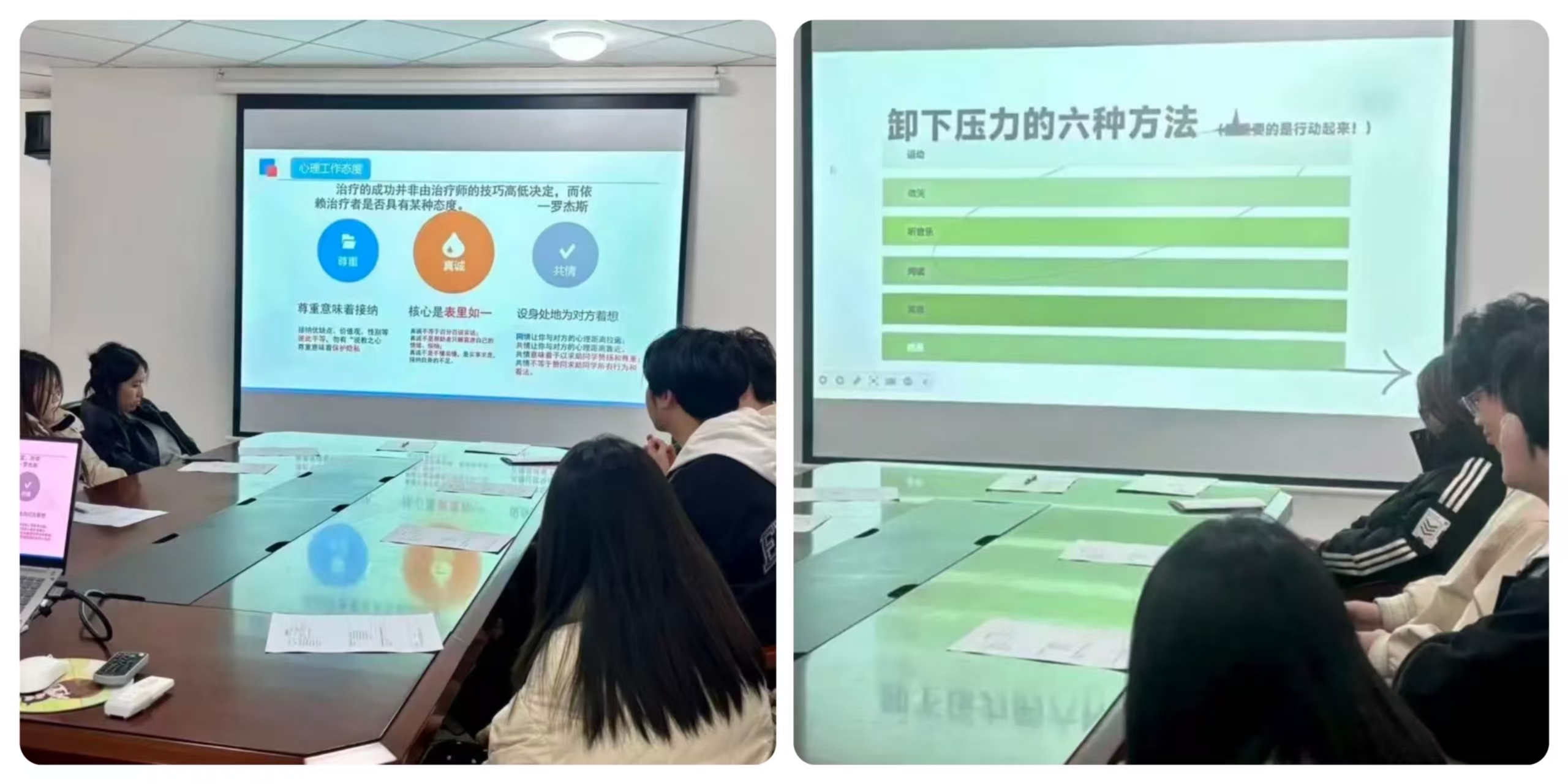 面对学干工作过程中易遭遇的压力与挫折,培训从压力的双重属性切入,指出认知方式决定压力影响。同时,通过区分挫折的积极与消极应对方式,鼓励学生干部以升华、补偿等积极心态转化挫折。此外,老师分享了冥想、感恩、运动等多种减压方式,助力大家高效调节状态。最后,全体学员在老师的带领下体验正念放松法,通过专注呼吸、舒缓身心,现场掌握实用减压技巧。引导学生干部在遭遇挫折时,主动采取理智、积极的应对方式,将挫折转化为成长的动力