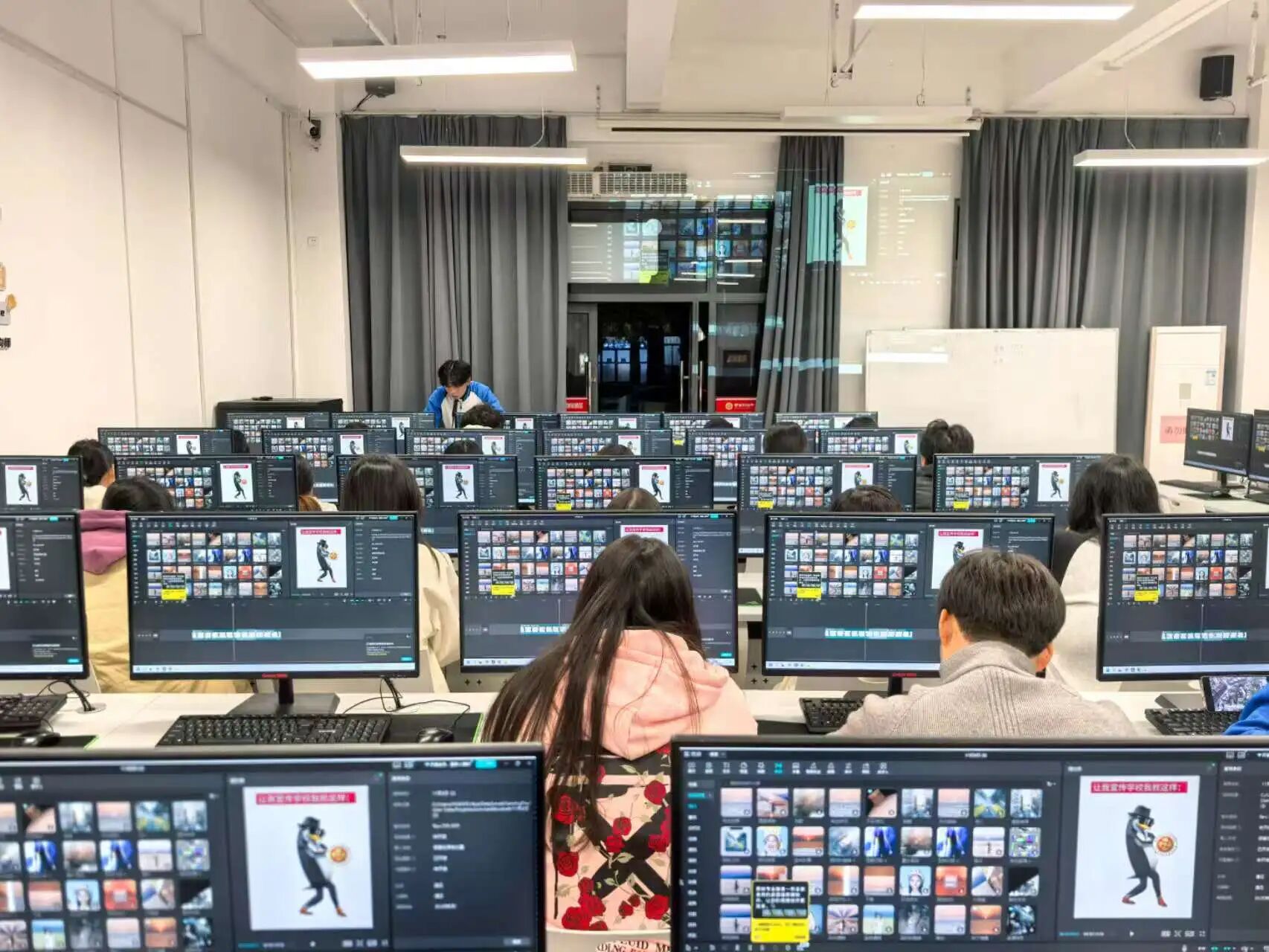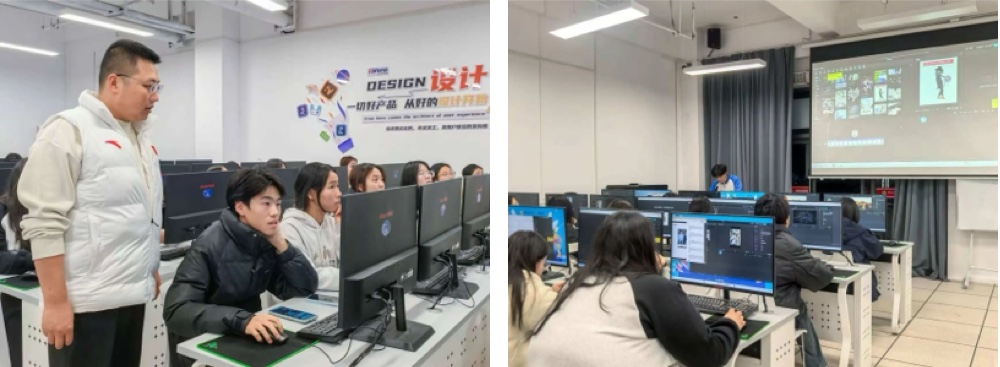 针对实操中的共性问题,活动采用“案例示范+即时答疑”模式。通过典型操作案例的大屏演示与关键节点标注,直观讲解“片段流畅衔接”“字幕音频同步”“模板参数自定义修改”等解决方案,尤其对转场特效选择与画面风格适配、美颜参数调节与场景匹配等易出错点进行重点拆解。现场同时提供一对一指导,针对同学们在模板修改、转场衔接卡顿、美颜效果不自然等问题进行精准答疑,确保每位同学都能吃透知识点、练熟实操技能,既帮助出错同学快速纠错,也让其他同学提前规避同类误区。