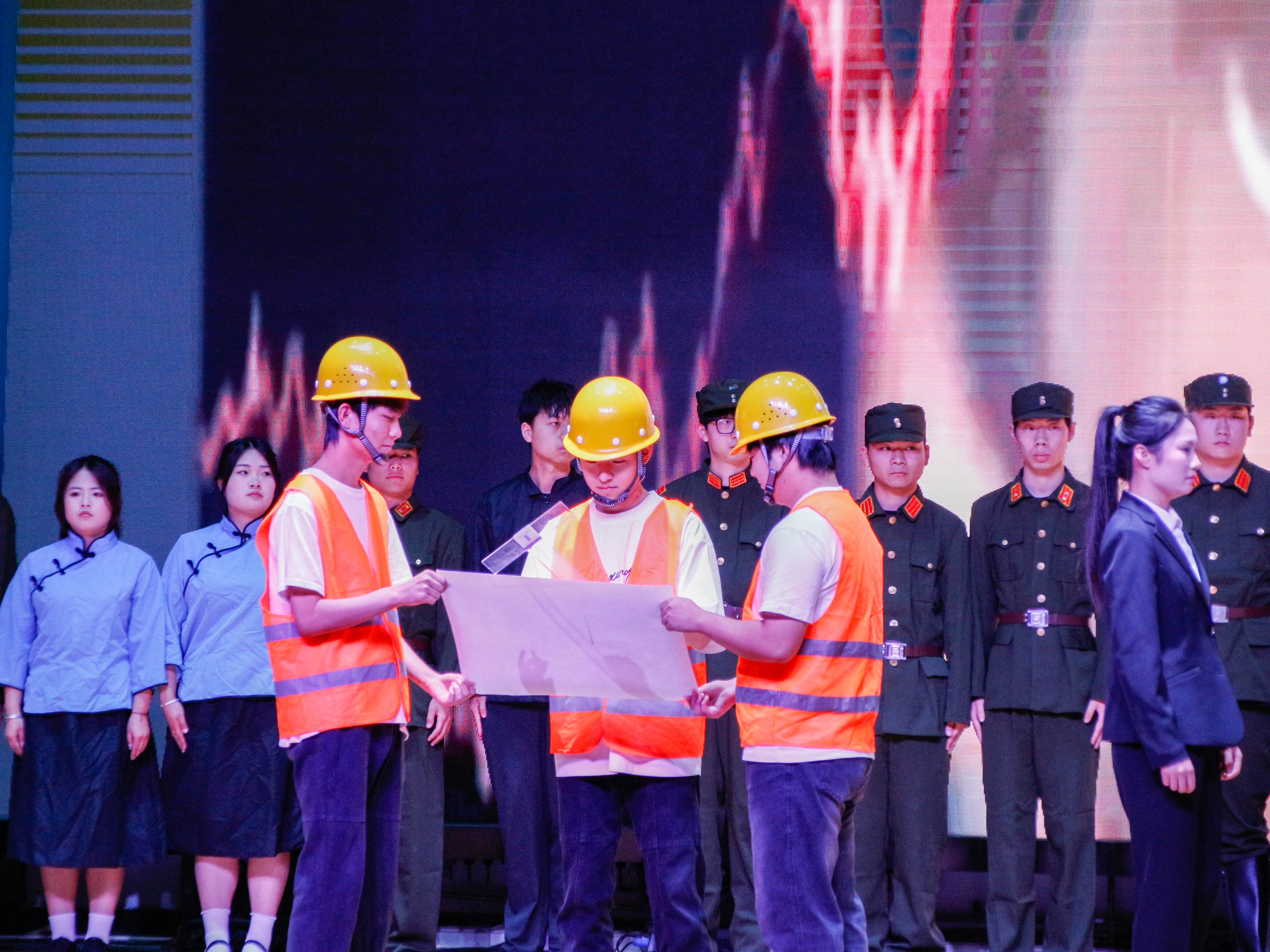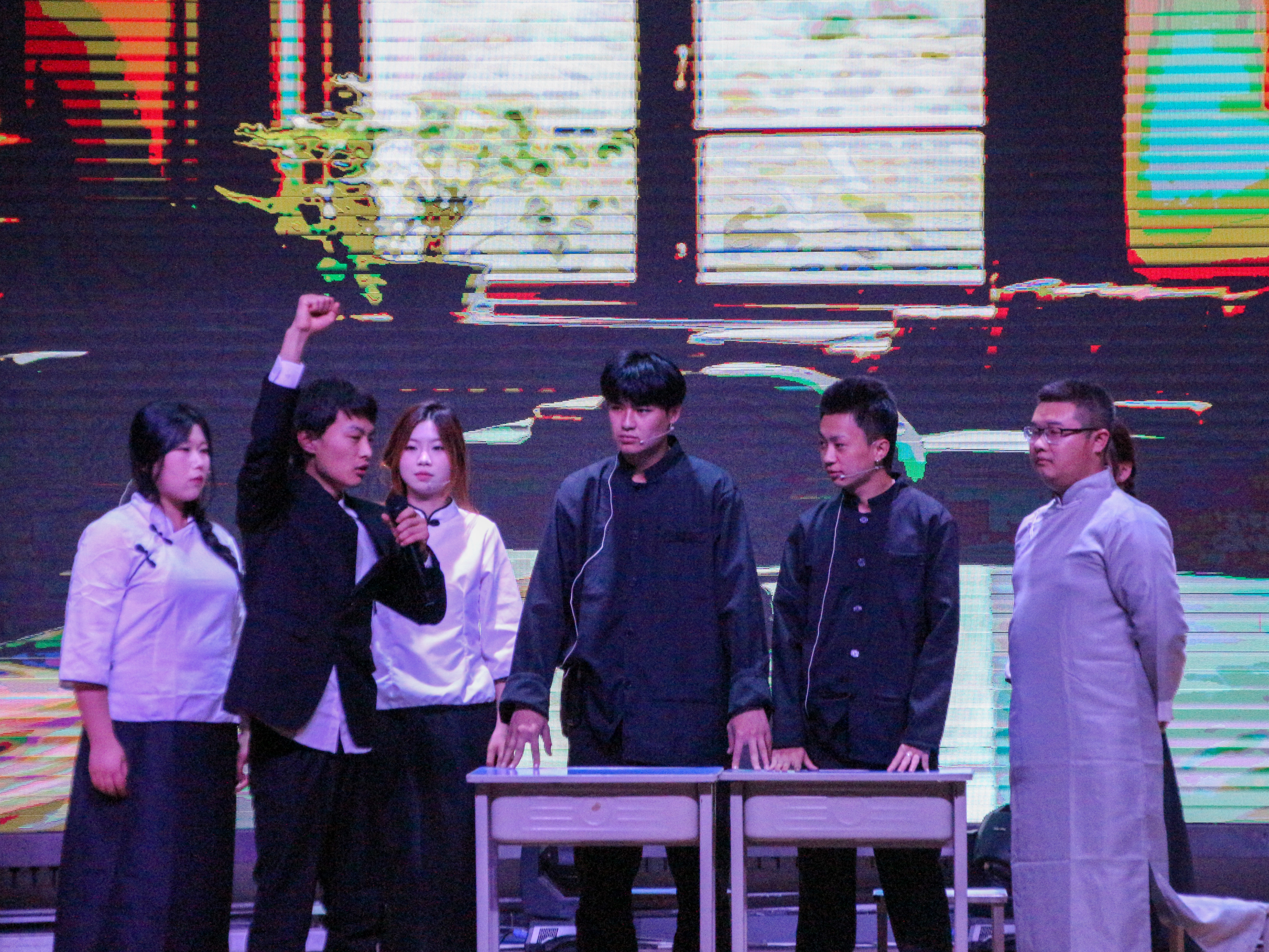 随后,各学院以舞台为笔勾勒历史与青春的画卷:全北学院的《烽火青春》将舞台化作硝烟弥漫的战场,青年学子们在战火中眼神坚毅,用颤抖却坚定的双手握紧笔杆,或是毅然扛起钢枪,生动展现了那个年代学子们的热血抉择与家国担当;经济与金融学院的《破晓的呐喊》聚焦 1936 年的西安,舞台上演员们重现那段风云激荡的岁月,以扣人心弦的演绎,展现动荡年代里青年学子与革命先辈们在黑暗中追寻光明、以热血诠释家国情怀的动人篇章;会计学院的《穿越时空的回信》别出心裁,通过“今昔书信对话”实现历史与现实的心灵共振让现代青年与抗战时期的英烈展开书信对话,配合着屏幕上祖国繁荣昌盛的画面,带领观众进行了一次震撼心灵的时空穿梭;人文艺术学院的《青春的呐喊 一二・九风云》以宏大的叙事和激昂的表演,重现了那段波澜壮阔的历史风云,学生们高举标语,振臂高呼,将青年汹涌澎湃的爱国热情展现得淋漓尽致;大数据与人工智能学院的《血色黎明:鹅城记忆》逼真还原了鹅城巷战的激烈场面,在炮火轰鸣与枪林弹雨中,当地人民不屈不挠、奋起抗争的英勇事迹被生动呈现;运动与健康管理学院的《归来》以细腻的表演,刻画了钱学森在危难时刻冲破重重阻碍,紧紧护住装满机密文件的行李箱,坚定不移报效祖国的决心;数字商务学院的《吾辈之青春》从抗战时期北平烽火中投笔从戎的燕大学子,到改革开放初期毅然归国的海外游子,再到当代突破芯片封锁的科研青年,不同时代的青春热血始终诠释着报国初心。