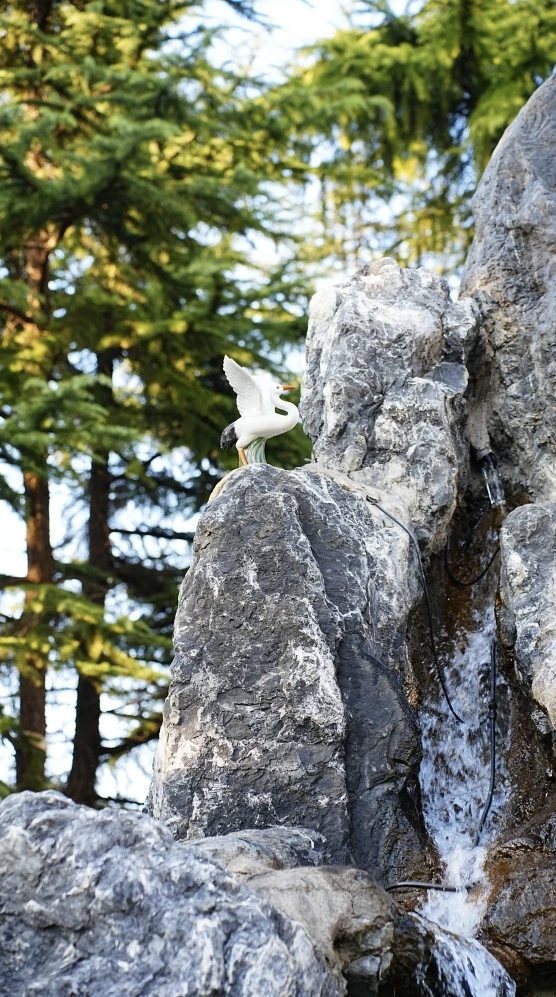 作品简介:“假山白鹤伴流泉,绿树添春意。